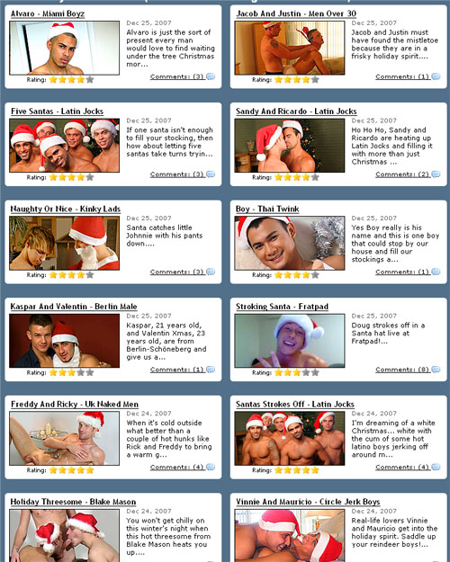 Last year I thought that Christmas themed porn was funny… but this year everyone is doing it! The snap above is just a sample of the sites throwing on santa claus hats and mostly hamming it up for the camera. I’m mostly distracted by Alvaro from Miami Boys… what a hottie! I have a huge thing for those latino boys… you would very rarely see them here in Australia.Now that Christmas is finished I’m busy getting ready for a trip down to the surf coast tomorrow with a couple of my mates. It seems like forever since I last got down to the beach.The screen grab above was taken from JustUsBoys.com.