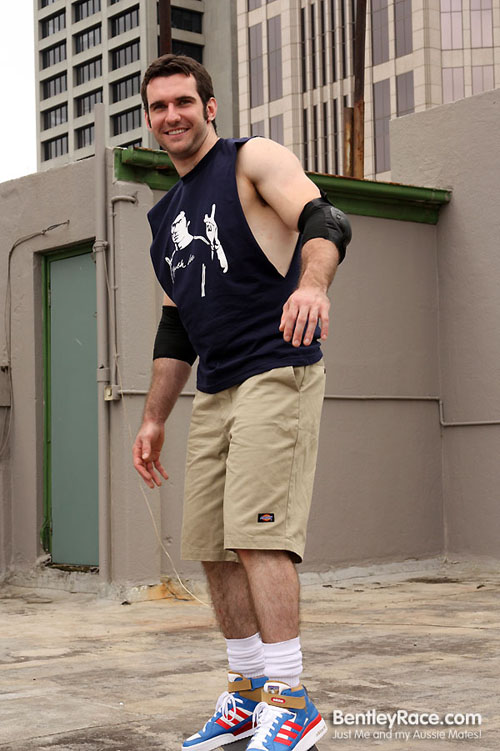 The past month has been so busy. As well as shooting a tonne of new videos for BentleyRace I have been helping American porn star Collin O’Neal source models and shoot for his new WorldofMen website. What a great concept he has. Collin travels the world picking out some of the hottest guys to shoot for his site. On this day the local gay radio station 94.9 Joy Fm dropped around to get some shots of Collin on my rooftop to help promote his site. I suggested that Collin get naked for this shot. My neighbours are used to seeing some naked booty up there now. That’s local photographer Ross Brownsdon taking the shots.